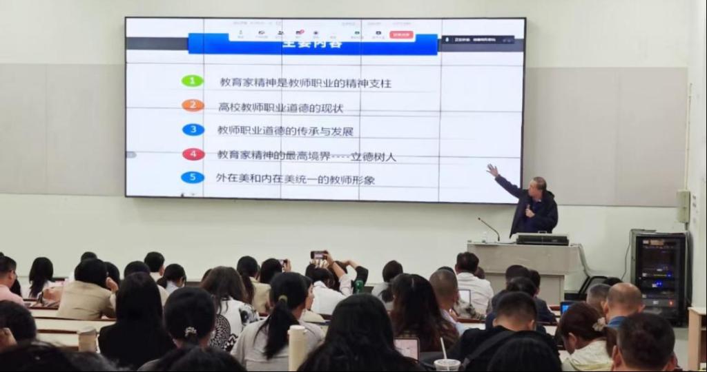 在培训中,陈教授进一步强调,教师们应当努力“以高尚师德、人格魅力、学识风范教育感染学生”,做学生健康成才的引路人。面对新时代的教育要求,陈教授强调,教师要建立科学的职业观,树立知行统一的师德观,并呼吁广大教师要做“四有”好老师:有理想信念、有道德情操、有扎实学识、有仁爱之心。此外,陈教授还详细解读了新时代高校教师职业行为十项准则与七条红线,帮助教师明确职业边界,筑牢思想防线。